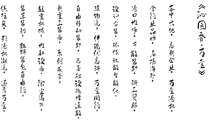 量身定制,港口、堆場,散體和粉體物料,裝船、堆高、輸送設備,工藝設計、設備制造 和安裝調試。提供整體解決方案和技術支持。提供全新的港口裝卸理念,輕松擴大港口經營范圍。